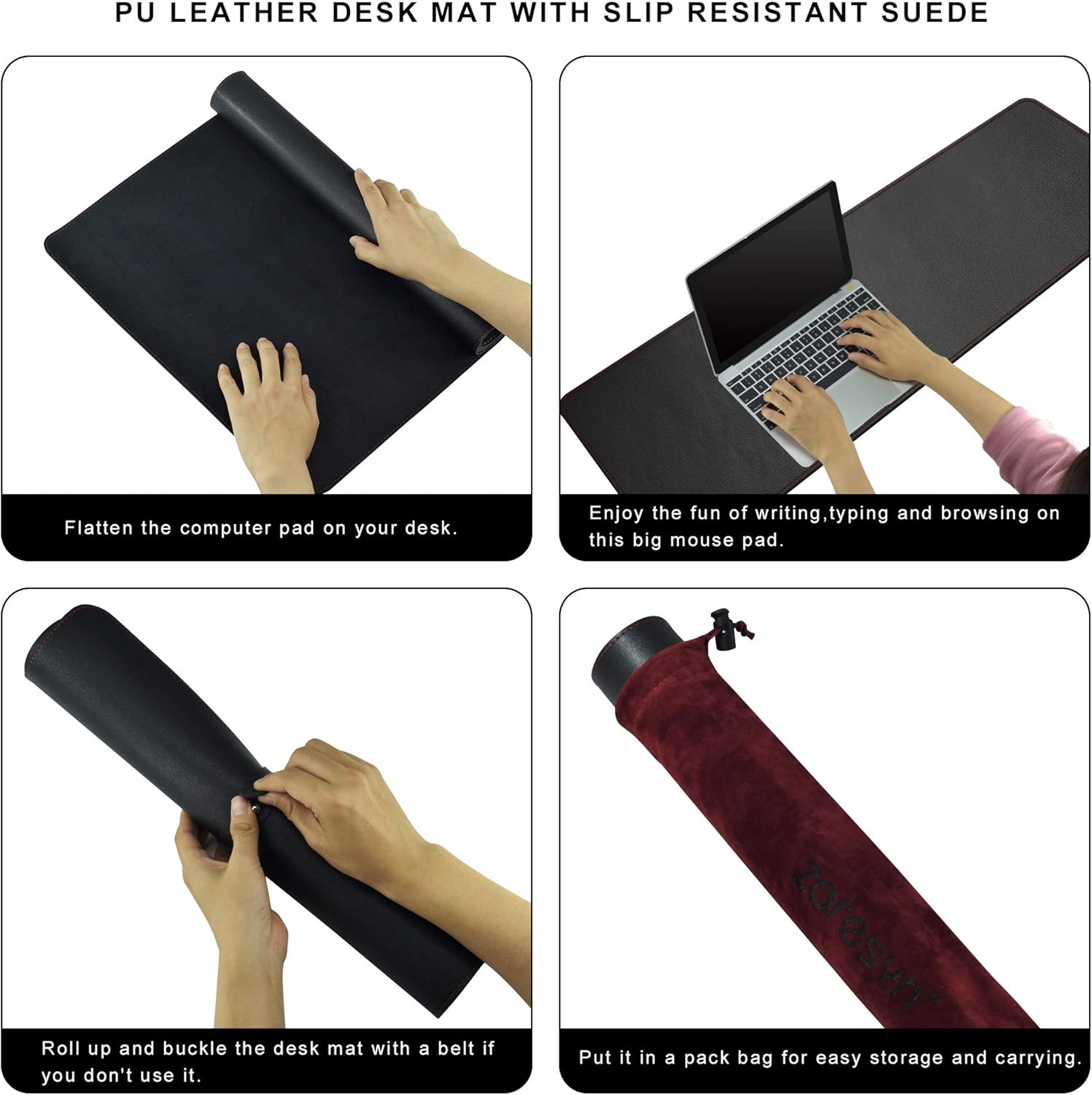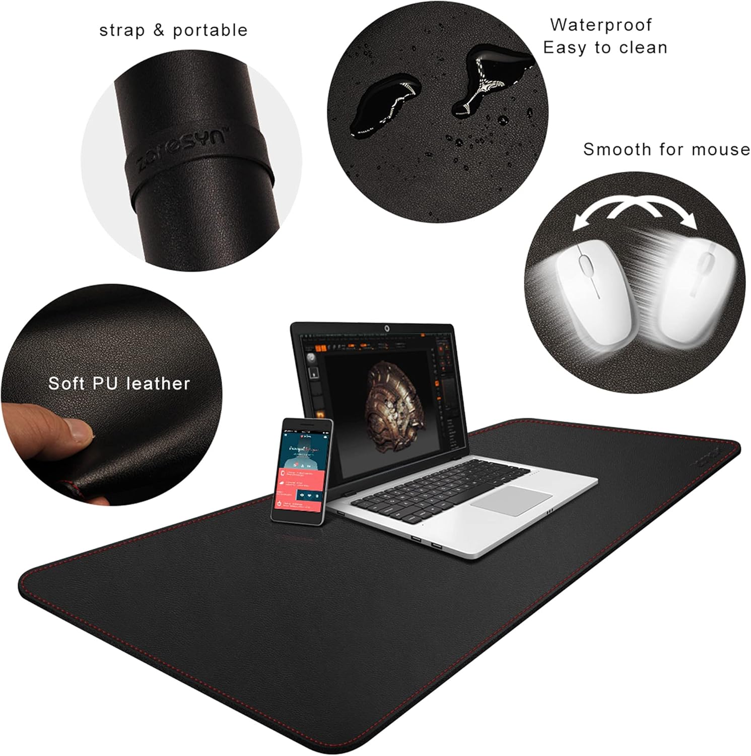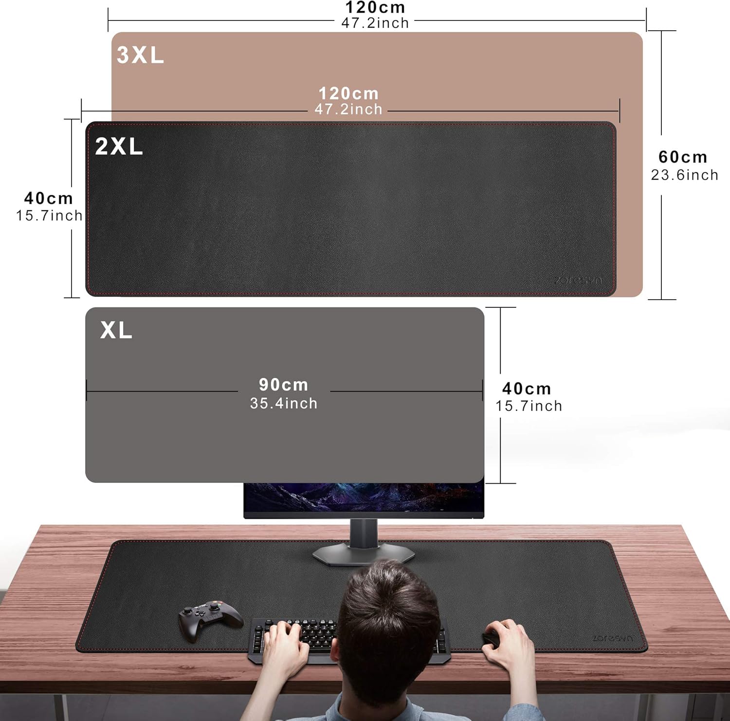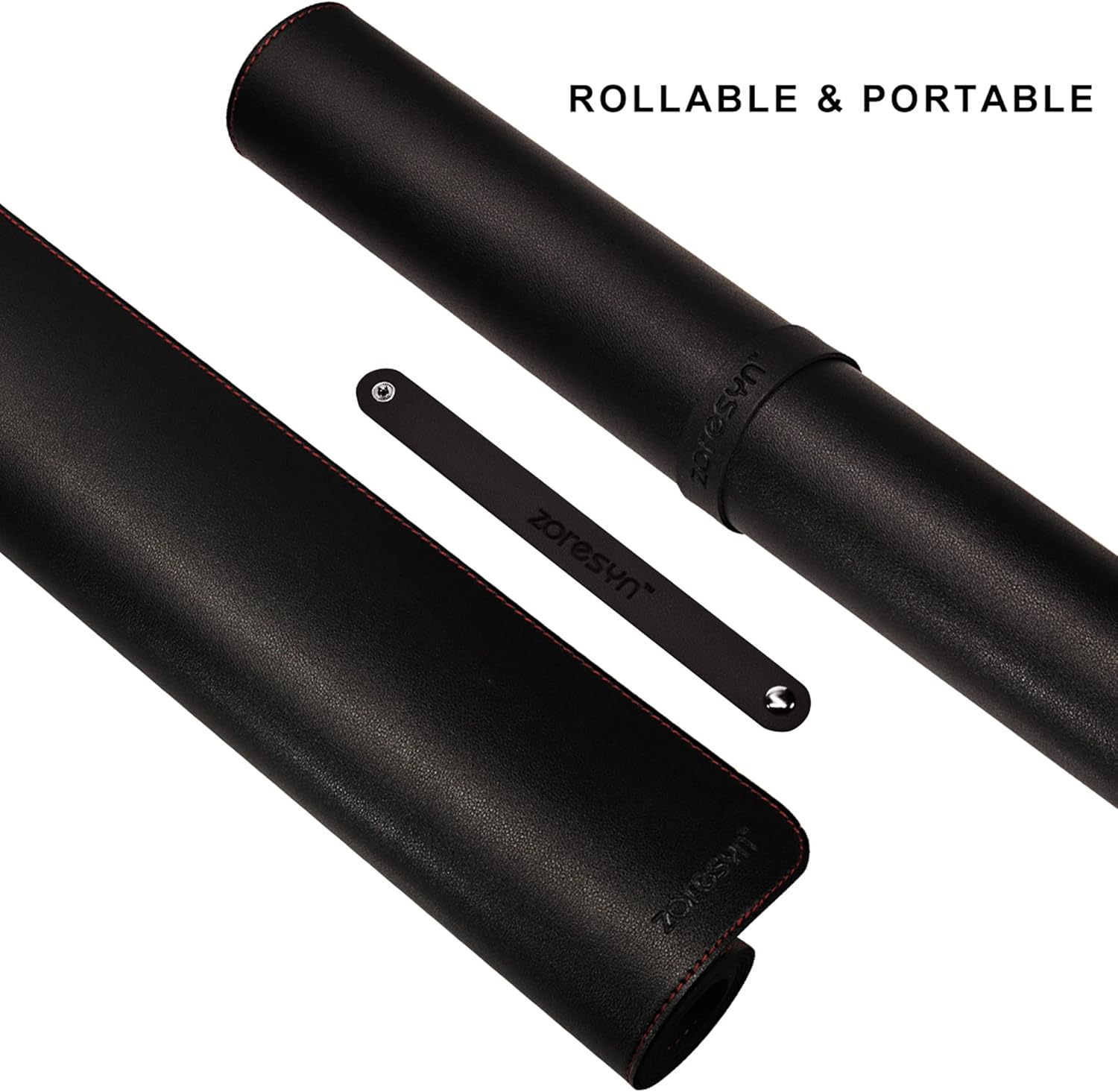 ZORESYN XXL Офис постелка от PU кожа (120 x 40 см, черна) - Неплъзгаща се постелка за бюро, водоустойчива постелка за мишка за домашен офис и лаптопи, протектор за маса с първокласни ръбове